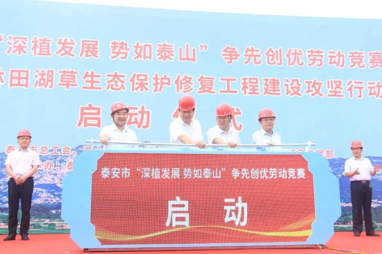 在啟動(dòng)儀式上,泰山區(qū)域山水林田湖草生態(tài)保護(hù)修復(fù)工程領(lǐng)導(dǎo)小組辦公室常務(wù)副主任劉培亭首先介紹了泰山區(qū)域山水林田湖草生態(tài)修復(fù)工程項(xiàng)目推進(jìn)情況。隨后,市總工會(huì)黨組書(shū)記、常務(wù)副主席郭青進(jìn)行了賽前動(dòng)員。參加儀式的領(lǐng)導(dǎo)共同為9勞動(dòng)競(jìng)賽先鋒隊(duì)代表進(jìn)行授旗。中國(guó)鐵工旗下中鐵(泰安)環(huán)境治理公司黨委書(shū)記、總經(jīng)理徐松苗代表參建單位和參建職工發(fā)出了倡議。最后,泰安市委常委、市委統(tǒng)戰(zhàn)部部長(zhǎng)張紅旗,市人大常委會(huì)黨組副書(shū)記、副主任、市總工會(huì)主席張書(shū)盈,集團(tuán)公司黨委副書(shū)記、工會(huì)主席年福兵,泰山區(qū)區(qū)委書(shū)記趙斌共同推動(dòng)活動(dòng)啟動(dòng)桿,正式拉開(kāi)了勞動(dòng)競(jìng)賽的序幕。