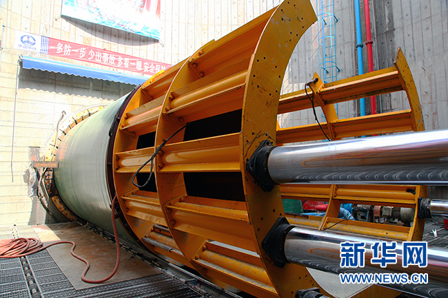 圖為沉井內(nèi)即將整體推進的頂管。